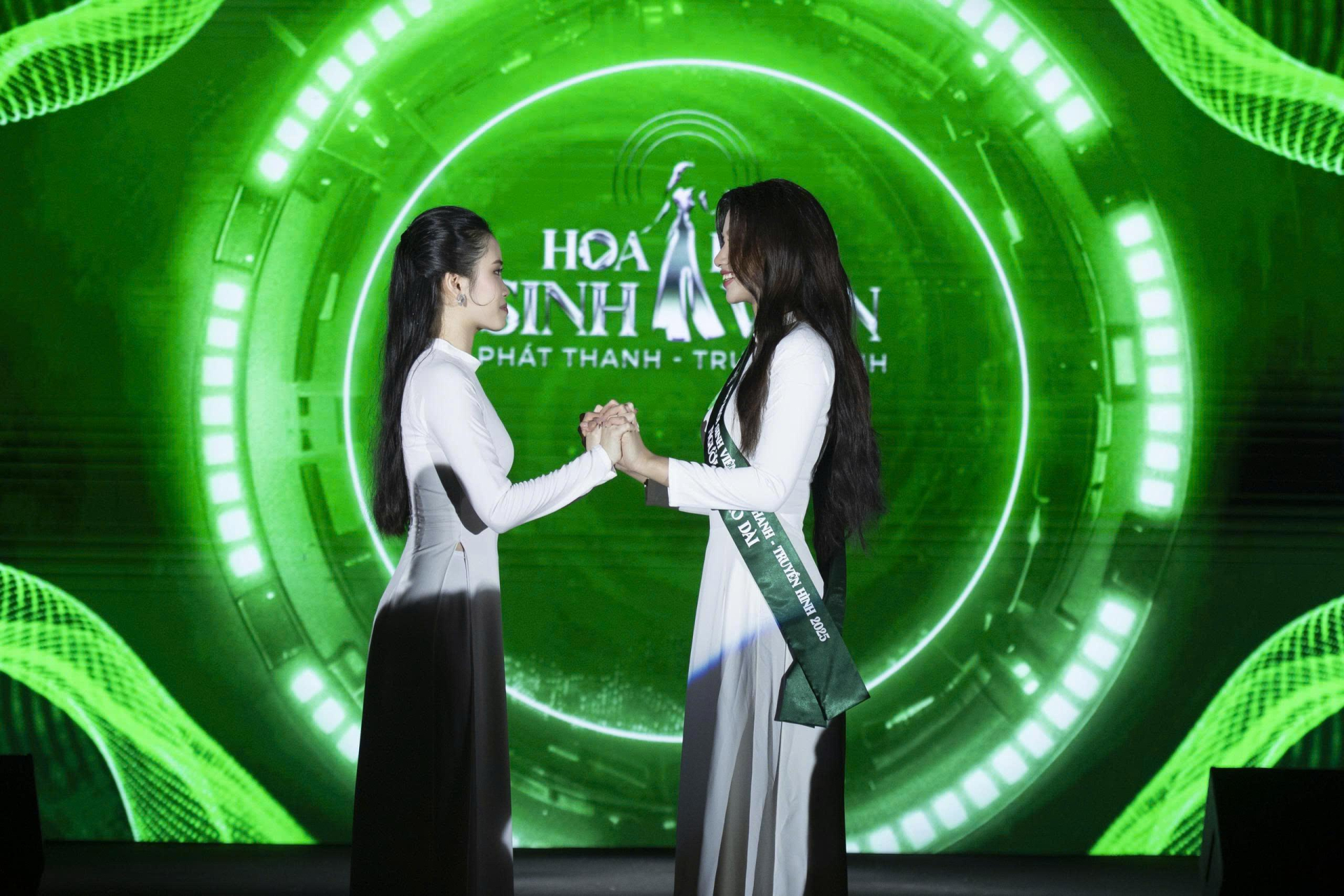Khoảnh khắc nắm tay của top 2 chung cuộc và chiến thắng gọi tên nữ sinh Nguyễn Ngọc Phương Trinh - Tân Hoa khôi Sinh viên Phát Thanh - Truyền hình 2025. Ảnh: BTC