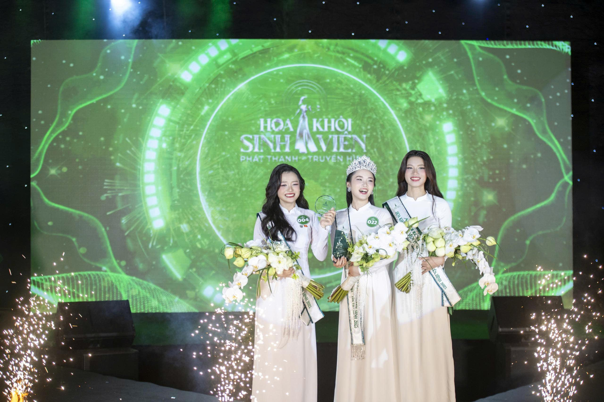ThS. Hồ Lê Hoàng Vũ - Trưởng khoa Công nghệ truyền thông, Trường Cao đẳng Phát thanh - Truyền hình II (Trưởng Ban Giám khảo - bên trái) và Đạo diễn - Nhà sản xuất Phạm Duy Khánh - CEO Five6 Entertainment (bên phải) trao danh hiệu Á khôi 1 cho Nhự Thị Hồng Linh - Trường Đại học Sư phạm TP. Hồ Chí Minh.